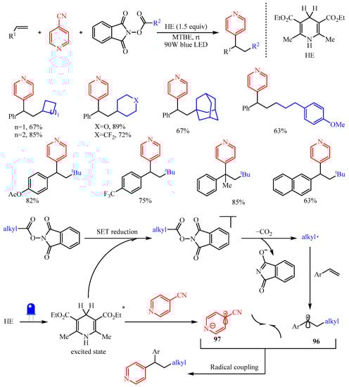 - Yu, J.M.; Zhu, L.W.; Hong, X.Y.; Gao, H.; Chen, T.T. Visible light-induced alkylpyridylation of styrenes via a reductive radical three-component coupling. Org. Biomol. Chem. 2021, 19, 5642–5648. [Google Scholar] [CrossRef] [PubMed]