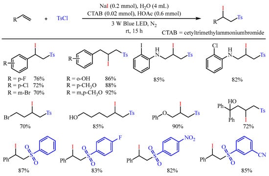 - Lin, L.; Yang, Z.L.; Liu, J.C.; Wang, J.X.; Zheng, J.L.; Li, J.L.; Zhang, X.B.; Liu, X.W.; Jiang, H.Z.; Li, J.H. Visible-light-induced surfactant-promoted sulfonylation of alkenes and alkynes with sulfonyl chloride by the formation of an EDA-complex with NaI in water at room temperature. Green Chem. 2021, 23, 5467–5473. [Google Scholar] [CrossRef]