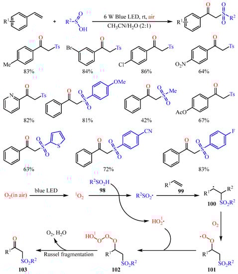 - Peng, Z.; Hong, Y.Y.; Peng, S.; Xu, X.Q.; Tang, S.S.; Yang, L.H.; Xie, L.Y. Photosensitizer-free synthesis of beta-keto sulfones via visible-light-induced oxysulfonylation of alkenes with sulfonic acids. Org. Biomol. Chem. 2021, 19, 4537–4541. [Google Scholar] [CrossRef]