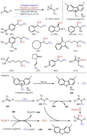 - Nadiveedhi, M.R.; Cirandur, S.R.; Akondi, S.M. Visible-light-promoted photocatalyst- and additive-free intermolecular trifluoromethyl-thio(seleno)cyanation of alkenes. Green Chem. 2020, 22, 5589–5593. [Google Scholar] [CrossRef]