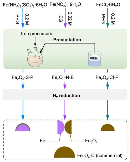 Different iron oxides were prepared by the precipitation methods by varying the iron precursors and the surfactants (Figure 1). The resultant precipitates derived from Fe(NH4)2(SO4)2·6H2O, Fe(NO3)3·9H2O, and FeCl3·6H2O were denoted as Fe2O3–S–P, Fe2O3–N–E, and Fe2O3–Cl–P, respectively. These samples were further subject to H2 reduction before the application in MO decomposition. In addition, a commercial sample denoted as Fe3O4–C was purchased as the reference.