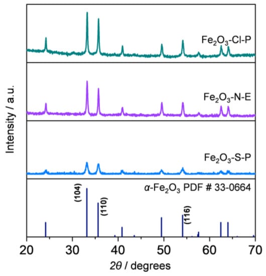 The compositions of the as-prepared iron oxides were first checked by powder X-ray diffraction patterns (PXRD, Figure 2). The representative diffraction lines corresponding to α-Fe2O3 (PDF # 33-0664) can be found for all the samples, confirming the successful synthesis of the targeted materials. In addition, these materials showed clear differences in the diffraction intensities with the order of Fe2O3–Cl–P ~ Fe2O3–N–E >> Fe2O3–S–P. The crystallite sizes of Fe2O3 were then estimated by using the Scherrer equation and the (104) facet. The sizes of Fe2O3–Cl–P, Fe2O3–N–E, and Fe2O3–S–P were determined to be 44, 33, and 15 nm, respectively. The morphologies of as-derived Fe2O3 were studied by combined electron microscopic techniques (Figure 3). Scanning electron microscopy (SEM) revealed the formation of condensed aggregates for Fe2O3–S–P and Fe2O3–N–E and the more homogeneous nanospheres for Fe2O3–Cl–P, which were likely resulting from the combined use of different iron precursors and surfactants. In line with the SEM observation, transmission electron microscopy (TEM) also confirmed the relatively smaller sizes of the irregular nanoparticles for Fe2O3–S–P and Fe2O3–N–E.