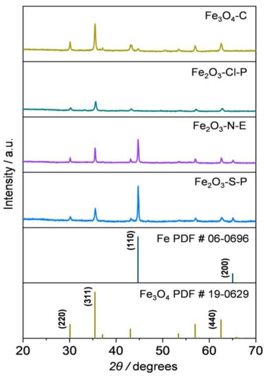 The PXRD patterns of the Fe2O3 and the commercial Fe3O4–C after H2 reduction at 350 °C were presented in Figure 4. The results can be grouped into two classes. Both Fe2O3–N–E and Fe2O3–S–P showed the predominant diffraction lines corresponding to the (110) facet of metallic iron (Fe0 PDF # 06-0696) with the coexistence of relatively weak diffractions related to the (311) and (220) facets of Fe3O4 (PDF # 19-0629). On the contrary, all the typical diffraction patterns of Fe3O4 were found for Fe2O3–Cl–P and Fe3O4–C, but with quite different intensities. The above results suggested the different redox abilities of these samples, which will be studied in detail in the next sections. Furthermore, it means Fe3O4 was probably the predominant phase with the coexisted Fe0 in Fe2O3–S–P and Fe2O3–N–E, while Fe3O4 was the main phase in Fe2O3–Cl–P and Fe3O4–C. Estimation of the crystallite sizes of Fe0 based on the (110) facet revealed comparable values between Fe2O3–S–P and Fe2O3–N–E (57 vs. 52 nm), while the sizes of Fe3O4 based on the (311) facet were determined to be 24, 53, 36, and 56 nm, respectively, for Fe2O3–S–P, Fe2O3–N–E, Fe2O3–Cl–P and Fe3O4–C.