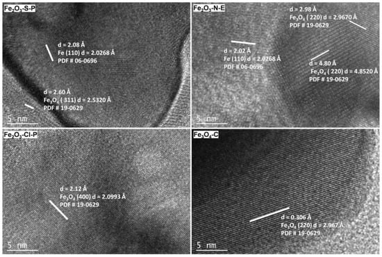 The morphologies of the reduced samples were assessed by TEM (Figure 5). Fe2O3–S–P and Fe2O3–N–E showed irregular-shaped particles, while Fe2O3–Cl–P can still preserve the sphere-like morphology. As compared with un-reduced iron oxides, the particle sizes became much larger, hinting at the severe aggregation during the reduction treatments. Additionally, Fe3O4–C also showed big particles of irregular shapes. To further assess the structural differences, high-resolution TEM (HRTEM) analyses of the reduced samples were conducted (inset in Figure 5 and S1). Among all these materials, a clear core–shell structure was evidenced only in Fe2O3–S–P. Detailed analyses of this material revealed the continuous lattice fringes of Fe(111) with a distance of 2.0268 Å, and in the periphery, the lattice fringes of Fe3O4(111) with a distance of 2.5320 Å were found (Figure 6). These observations, therefore, ambiguously pointed to the formation of Fe0 as the core covered with a thin shell of Fe3O4. As in the case of Fe2O3–S–P, the lattice fringes of both Fe(110) and Fe3O4(220) facets were observed in Fe2O3–N–E. These two facets were also in close proximity, suggesting the presence of Fe–Fe3O4 interfaces. In contrast, lattice fringe analyses of Fe2O3–Cl–P and Fe3O4–C only found the presence of the Fe3O4 phase. In general, the TEM observations were highly consistent with the PXRD results.