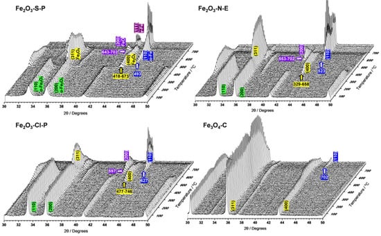 The redox properties of a catalytic material play an important role in the Fenton chemistry. Therefore, different techniques were applied to assess the redox properties of the as-derived iron oxides. The phase transitions of different iron compositions in flowing H2 from room temperature to 700 °C were followed by in situ PXRD (Figure 7). Both Fe2O3–S–P and Fe2O3–N–E showed very similar phase transition patterns. Namely, the Fe3O4 phase in these two samples vanished at much lower temperatures as compared with Fe2O3–Cl–P (658–673 vs. 746 °C). Meanwhile, the appearance of Fe0 diffractions emerged at significantly lower temperatures (493–523 vs. 627 °C). Differing from the three as-prepared Fe2O3 materials, which showed the reduction to different degrees, the in situ PXRD patterns of Fe3O4–C indicated that this material was extremely difficult to reduce. The Fe3O4 phase predominated with only very weak diffractions related to Fe0. Overall, these results suggested the very different reduction propensities of the materials with the order of Fe2O3–S–P ~ Fe2O3–N–E > Fe2O3–Cl–P >> Fe3O4–C.
