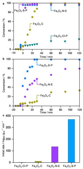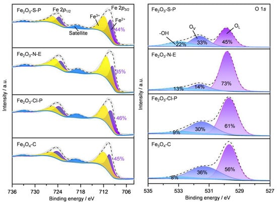 The different surface iron and oxygen species of the reduced iron oxides were studied by X-ray photoelectron spectroscopy (XPS, Figure 8), as they were suggested to have important influences on the redox and Fenton chemistry. The Fe 2p spectra of all the samples showed a doublet at 736–706 eV with a satellite around 718 eV. The spectra were analyzed by peak fitting with Fe2+ and Fe3+ species with known peak positions from the literature results. It was determined that the shares of Fe2+ were comparable for Fe2O3–S–P, Fe2O3–Cl–P, and Fe3O4–C (44–46%) and were much higher than that of Fe2O3–N–E (35%). The O 1s of these reduced samples were also analyzed by fitting the spectra. It was revealed that Fe2O3–S–P, Fe2O3–Cl–P, and Fe3O4–C possessed similar shares of oxygen vacancy (Ov, 30–36%), while it was the lowest for Fe2O3–N–E (14%).