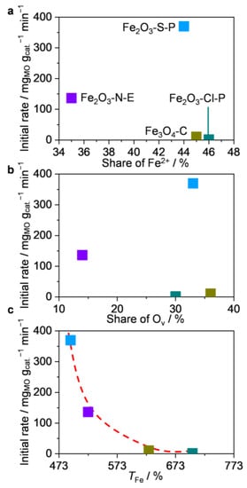 The initial reaction rates of different iron oxides as a function of (a) surface Fe2+ ratio, (b) oxygen vacancy, and (c) TFe (the temperature corresponding to the appearance of Fe0 phase from in situ PXRD). TFe can be viewed as an indicator of the redox properties of the respective catalysts.