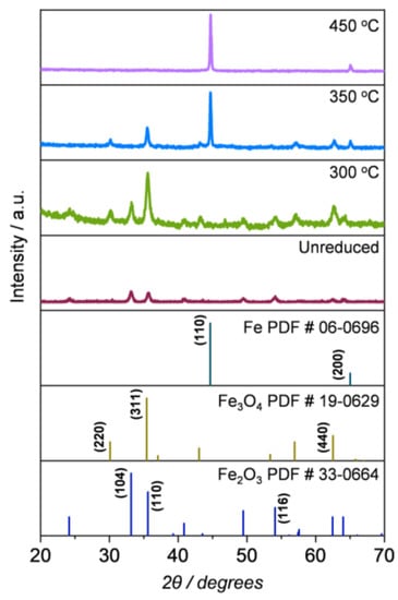 The PXRD patterns of Fe2O3–S–P after reduction in H2 at 300–450 °C. Vertical lines are the reference standards.