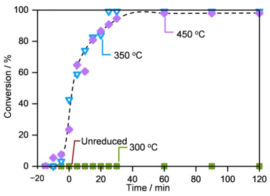 Having derived different compositions of the iron-based materials from Fe2O3–S–P, their activity in MO decomposition was evaluated (Figure 12). The results showed that the samples reduced at 350 and 450 °C displayed basically the same activity, whereas no appreciable conversion can be observed for the unreduced sample and after 300 °C reduction. Combined with the activity evaluation, it can be concluded that Fe0 or Fe0/Fe3O4 were responsible for the catalytic activity, but both Fe3O4 and Fe2O3, when used alone, were completely inactive in Fenton chemistry.