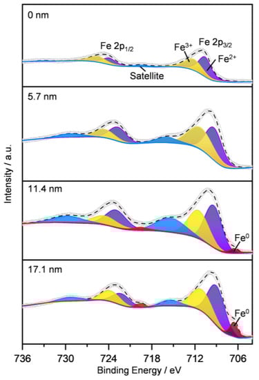 Although the iron oxide in Fe2O3–S–P was completely converted into Fe0 after 450 °C reduction based on PXRD, the exposure to air should easily lead to the formation of a thin oxide layer. It means for this sample, both Fe0 and Fe3O4 might co-exist, like in the case of the sample reduced at 350 °C. To prove the speculation, XPS with depth profile analysis was performed on Fe2O3–S–P after 450 °C and exposure to air (Figure 13). The fitting of the Fe 2p XPS spectra evidently revealed the exclusive presence of both Fe3+ and Fe2+ species at the outer surfaces, while the contribution of Fe0 emerged up to a depth of 11.4 nm, and the share became larger, subject to further sputtering. The results thus confirmed the formation of an iron oxide layer of ca. 11–17 nm thickness owing to the auto-oxidation of metallic iron. In addition, the previous TEM and PXRD results of Fe2O3–S–P after 350 °C reduction also indicated the presence of the Fe@Fe3O4 core–shell structure and a thickness of Fe3O4 layer of <24 nm. Therefore, the similar activity of Fe2O3–S–P subject to 350–400 °C reduction can be attributed to the presence of similar Fe@Fe3O4 core–shell structures. On the other hand, Fe2O3–N–E with both Fe0 and Fe3O4 as the major phases without the apparent core–shell structures exhibited relatively lower activity as compared to Fe2O3–S–P. Albeit an interface between both phases was confirmed by HRTEM, no core–shell structures can be observed, plus the Fe3O4 particle sizes (ca. 54 nm) were much larger as compared with the layer thickness in Fe2O3–S–P. These factors might lead to a reduced number of interface structures and, thus, lower activity.