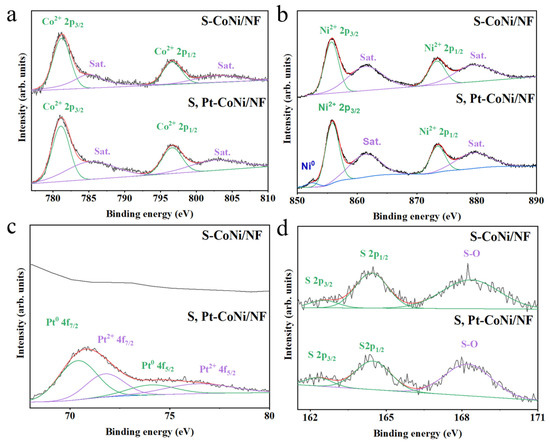 As shown in Figure 2b, the Ni 2p spectra of the S-CoNi/NF and S, Pt-CoNi/NF catalysts show two peaks located at 855.7 and 873.3 eV, which are ascribed to the Ni2+ 2p3/2 and Ni2+ 2p1/2, while the peaks of 861.5 eV and 879.6 eV belong to the satellite peaks [40]. The peak located at 852.4 eV corresponds to the Ni0 signal, indicating the electron transfer from Pt to adjacent S-CoNi, which leads to the decreased valence states of Ni. This phenomenon can be further confirmed by the Pt 4f spectrum. Figure 2c provides information regarding the XPS spectra of Pt 4f, which can be divided into two pairs of peaks. The peaks observed at 70.4 eV and 74 eV are both ascribed to Pt0 species, while the peaks at 71.8 and 76.6 eV belong to the Pt2+ 4f7/2 and Pt2+ 4f5/2, respectively [41]. The appearance of the Pt2+ species confirms that the possible electronic interaction between the Pt species and S-CoNi material. In addition, the S 2p spectra of both S-CoNi/NF and S, Pt-CoNi/NF samples are also shown in Figure 2d. Two peaks with the binding energies of 162.4 eV and 164.4 eV originate from the S 2p3/2 and the S 2p1/2 of the metal-S bonds, while the peak located at the binding energy of 168.2 eV corresponds to the typical S-O peak. This S-O peak should be related to the partial surface oxidation when it is exposed to air [42]. In addition, the signals of metal bonds confirm that some metal sulfides (CoNiSx) should be present on the surface of the S-CoNi/NF sample and the S, Pt-CoNi/NF sample. All of the abovementioned experimental results prove the successful synthesis of S, Pt co-modified CoNi materials, which are expected to have excellent catalytic activity for HER.