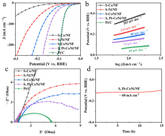 Specifically, the S, Pt-CoNi/NF catalyst exhibits a much better catalytic performance than the other control samples, and it only needs an overpotential of 150 mV to reach the current density of 138 mA cm−2. In contrast, at the same overpotential, the S-CoNi/NF catalyst is limited to 62 mA cm−2. At the same current density of 50 mA cm−2, S, Pt-CoNi/NF catalyst needs the lowest overpotential of 116 mV. The overpotentials are increased by 27 mV, 165 mV, and 62 mV relative to S-CoNi/NF (143 mV), S-Co/NF (281 mV), and S-Ni/NF (178 mV), respectively. Notably, the commercial Pt/C shows a smaller overpotential of 72 mV than S, Pt-CoNi/NF (Table 1), which should be the case because of the high loading mass of Pt nanoparticles on commercial Pt/C sample. In addition, the overpotential of S, Pt-CoNi/NF is 184 mV at a high current density of 300 mA cm−2. Figure 3b shows the Tafel slope of S, Pt-CoNi/NF (75 mV dec−1), which is higher than commercial Pt/C (49 mV dec−1) but smaller than the S-CoNi/NF (89 mV dec−1), S-Co/NF (203 mV dec−1), and S-Ni/NF (114 mV dec−1) catalysts. The smaller Tafel slope of S, Pt-CoNi/NF suggests its favorable electrocatalytic kinetics for HER after the dual modification of S-anions and Pt species.