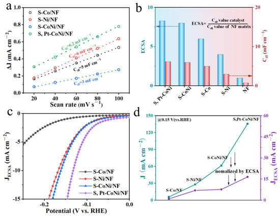 The active surface area of the catalyst is an important indicator of the exposure number of the catalytic sites, which is directly related to the electrocatalytic activity. Therefore, the double-layer capacitances (Cdl) are further used in order to estimate the surface active areas of the prepared samples. The CV curves are recorded at a non-faraday range at scanning rates of 20, 40, 60, 80, and 100 mV s−1 (Figure S14). We then derived the current density values of CV curves that measured at different scan rates at the potential of 1.0 V, and we plot these values with the scan rates [43,44,45,46]. The corresponding Cdl values can be obtained by linear fitting, as shown in Figure 4a. The S, Pt-CoNi/NF sample shows the largest surface area among all of the prepared samples. Compared to S-CoNi/NF (6 mF cm−2), S-Co/NF (5 mF cm−2), S-Ni/NF (3 mF cm−2), and S-NF (0.75 mF cm−2), the S, Pt-CoNi/NF has the highest Cdl (6.2 mF cm−2) and ECSA (8.3) values (Figure 4b). These observations clearly show that the surface area of S, Pt-CoNi/NF is increased by a factor of more than eight times over that of the blank NF substrate, significantly raising the electrocatalytic HER activity. Figure 4c demonstrates that the S, Pt-CoNi/NF electrode has the best catalytic performance across all developed catalysts, even after the normalization of ECSA. The current density of S, Pt-CoNi/NF can approach 15 mA cm−2 under the overpotential of 150 mV (Figure 4d), which is substantially greater than that of S-CoNi/NF (7.5 mA cm−2), S-Co/NF (1 mA cm−2), and S-Ni/NF (7 mA cm−2). This indicates that the higher intrinsic activity of S, Pt-CoNi/NF originates from multiple factors.