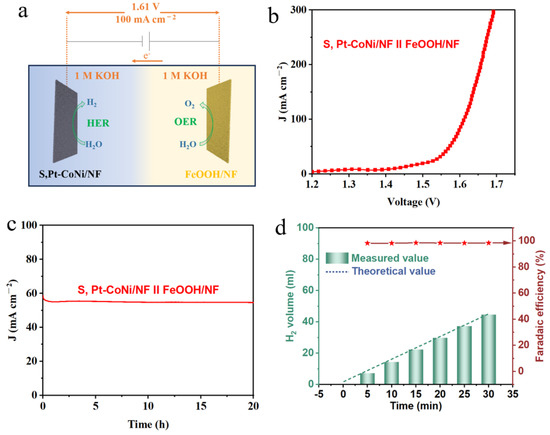 (a) Diagram of two-electrode system; (b) LSV curve; (c) chronopotentiometry test at a voltage of 1.58 V of S, Pt-CoNi/NF||FeOOH/NF electrolyzer for overall water splitting in 1 M KOH; (d) The generated volume and Faradaic efficiency of H2 by using S, Pt-CoNi/NF as cathode for water splitting.