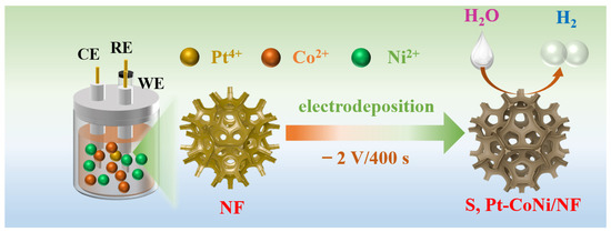 In a typical synthesis process, several pieces of NF (2 × 1 cm) are pre-treated before use. The NF substrates are first put into acetone, water, and 3.0 M HCl for ultrasonication 10 min, respectively. Next, the NF substrates are taken out and dried in a vacuum oven. Then, the electrodeposition process is conducted in a three configuration, including a saturated Ag/AgCl electrode, platinum foil, and the NF substrate. The electrolyte for electrodeposition can be prepared by adding different chemicals. For the preparation of S, Pt-CoNi/NF, the 0.12 g Ni(NO3)2, 0.12 g Co(NO3)2, 3 g CH4N2S, and 1.5 g NH4F are added to 50 mL of deionized water (DI) in order to form a uniform solution. A total of 600 μL H2PtCl6 (10 mg/mL) is then added to the above solution before electrodeposition. For other S-CoNi/NF, S-Co/NF, and S-Ni/NF samples, the dual metal salts or single metal salt are added when the other chemicals are being kept the same. Next, the electrodeposition is performed by using NF as working electrode. The electrodeposition process is carried out at a constant voltage of −2 V for 400 s, and the corresponding products are labeled as S, Pt-CoNi/NF, S-CoNi/NF, S-Co/NF, and S-Ni/NF.