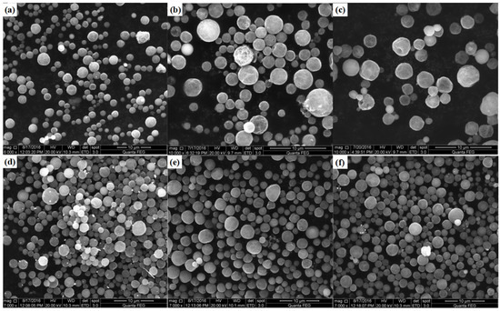The crystal structure of B-phase titanium dioxide supported by gold was analyzed in-depth by X-ray diffraction spectra (XRD), which involved the identification of the crystal phases and the properties of phase composition. As depicted in Figure 3, the sample represented by curve “a” was prepared using spray pyrolysis at 150 °C and treated with annealing at 370 °C for an hour, exhibiting a relatively standard XRD pattern of B-phase titanium dioxide with characteristic peaks at positions 24.9°, 28.6°, 43.5°, and 48.5°, all belonging to B-phase titanium dioxide (JCPDS 46-1237). Next, we compared the curves “a”, “d”, “e”, and “f”, which were obtained by spraying at the same temperature, but with different amounts of gold loading. As indicated by the result, when 0.1% gold was added to B-phase titanium dioxide, the XRD pattern of the B-phase titanium dioxide remained unchanged. However, with the increase of the gold loading, the peak intensity of the gold XRD characteristic peaks (38.3°, 44.5°, 64.7°) was also increased. The result above suggests that with an increase in the amount of chloroauric acid added to the precursor solution, the proportion of gold in the final B-phase titanium dioxide–gold porous microspheres was also increased. Subsequently, curves “a”, “b”, and “c” were compared. The result indicates that when the sample was prepared by spray pyrolysis at 200 °C and 250 °C and then annealed, the resulting B-phase titanium dioxide exhibited a certain degree of phase transformation, with the four characteristic peaks at 25.3°, 48.1°, 53.9°, and 55.1° representing the anatase phase of titanium dioxide. This finding revealed that the B-phase titanium dioxide obtained by spray pyrolysis exhibits better dispersibility, such that it can be more easily transformed. The comparison of curves “b”, “c”, and “e” indicated that the samples prepared by spraying at 200 °C and 250 °C exhibited a slight transformation from the B-phase to the anatase phase in comparison with those prepared at 150 °C. Furthermore, although the amount of chloroauric acid added to the precursor solution for the three samples before preparation was the same, the peak intensity of the gold characteristic peak in the samples prepared at 200 °C and 250 °C was stronger than that of the sample prepared at 150 °C. The possible reason for this result is that at higher temperatures, the gold particles tend to aggregate more, thus making it easier for them to crystallize during the subsequent annealing process and resulting in better crystalline gold particles. The XRD spectra suggests that different spray pyrolysis temperatures exerted significant effects on the gold particles and the structure of B-phase titanium dioxide in the gold-loaded samples.