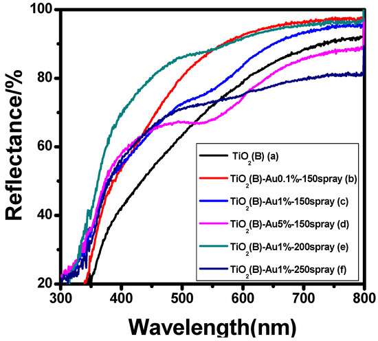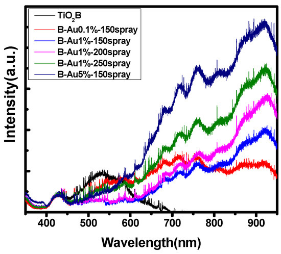 In the PL test results, a distinct emission peak in the range of 700–1000 nm esd was first observed with the introduction of gold, which was absent in the pure phase B-phase titanium dioxide. The intensity of the emission peak esd increased with the amount of gold loading. Furthermore, for samples with the same mass ratio of gold loading on the surface of B-phase titanium dioxide, the PL peak of gold esd decreased with the decrease of the spray temperature. The possible reason for this result is the less pronounced plasma resonance absorption with a smaller gold particle size, resulting in weaker PL intensity [57]. The above-described finding is consistent with the previous scanning electron microscopy and transmission electron microscopy images, suggesting that the samples prepared under low-temperature spray conditions had smaller gold particles that were less likely to aggregate.