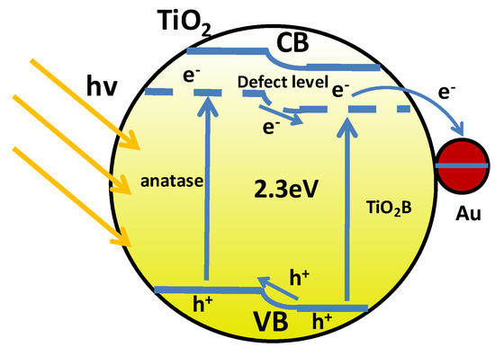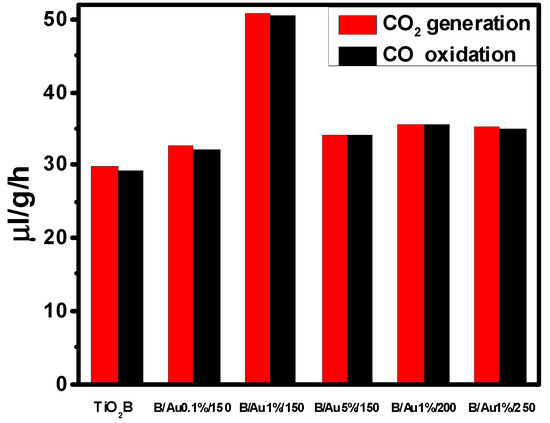 The following mechanism diagram was generated in accordance with the above-mentioned data (Figure 7). First, B-phase titanium dioxide with visible light absorption was synthesized (the bandgap of traditional B-phase titanium dioxide of 3.13 eV) [60]. Subsequently, the gold nanoparticles were modified using the spray pyrolysis method onto the surface of the B-phase titanium dioxide. Moreover, the B-phase titanium dioxide was transformed into a mixture of locally ordered visible-light-absorbing anatase and B-phase titanium dioxide. The gold loading led to the increased separation efficiency of photo-generated electrons and holes in the anatase/B-phase titanium dioxide interface, such that the probability of electron–hole recombination on the surface of anatase/B-phase titanium dioxide was reduced. As a result, the efficiency of photo-generated electron transfer to carbon monoxide was increased, such that the activity of photocatalytic carbon monoxide oxidation to carbon dioxide could be increased.