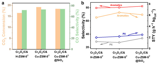 Catalytic performance of the bifunctional catalysts composed of Cr2O3/C and H-ZSM-5T or Cu-ZSM-5T or Cu-ZSM-5T@SiO2: (a) CO2 conversion and CO selectivity, (b) space-time yield of (STY) and selectivity of PX and aromatics. Reaction conditions: 350 °C, 3 Mpa, (24.3% CO2, 71.8% H2, and 3.9% Ar), GHSV = 1200 mL gcat−1 h−1, time on stream (TOS) = 8 h, metal oxide/zeolite mass ratio = 1, and catalyst of 1 g.