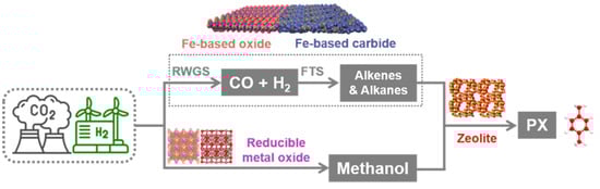 The modified FTS and the methanol-mediated pathways for PX synthesis from CO2 hydrogenation.