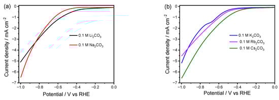 LSV curves of Cu electrode in 0.1 M CO2-saturated electrolytes. (a) Li2CO3 and Na2CO3 and (b) K2CO3, Rb2CO3, and Cs2CO3. Scanning rate of 50 mV s−1.