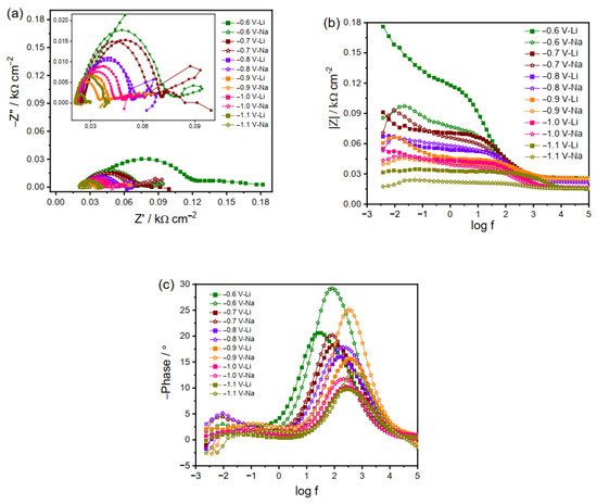 EIS spectra of Cu electrode in CO2-saturated 0.1 M Li2CO3 and Na2CO3 under more negative bias voltage (−0.6 to −1.1 V). (a) Nyquist plots and corresponding Bode plots of (b) impedance vs. frequency and (c) phase vs. frequency. Inset is zoom-in of the figure.