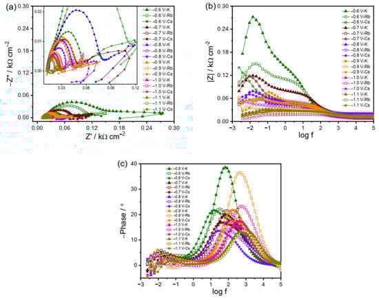EIS spectra of Cu electrode in CO2-saturated 0.1 M K2CO3, Rb2CO3, and Cs2CO3 under more negative bias voltages (−0.6 to −1.1 V). (a) Nyquist plots and corresponding Bode plots of (b) impedance vs. frequency and (c) phase vs. frequency. Inset is zoom-in of the figure.