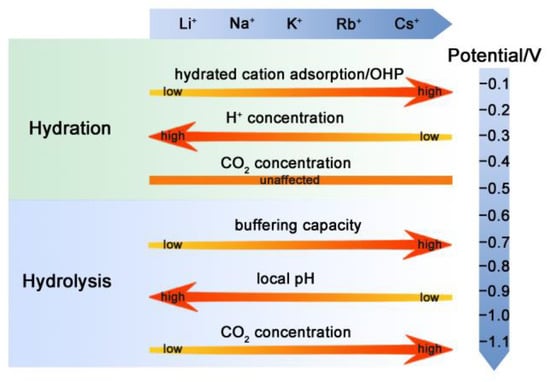 At high negative potentials, CO2 is consumed quickly, and a local pH gradient is built [46]. Thus, the hydrolysis of cations starts to take action, which can provide a buffering effect on the local pH (Figure 6). The reaction in electrolytes with large cations (K+, Rb+, and Cs+) and dominant CO2RRs are taken as an example. In general, the cations undergo hydrolysis by following Equation (2):