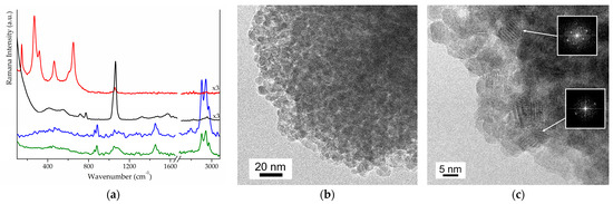 (a) Raman spectra of intermediates and product in the synthesis of Z1: gel in green, the liquid removed from the gel in blue, the obtained xerogel in black and the product obtained by MW-calcination in red; (b,c) HR-TEM images of Z1 and simulated (FFT) electronic diffraction of (101) and (112) family planes with dhkl of 0.299 and 0.183 nm, respectively, in the inset (ICCD PDF card n. 01–088-1007).