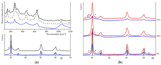 The structure and crystallinity of the samples were investigated by X-ray diffraction powder (PXRD) using an X’Pert powder diffractometer operating in a Bragg–Brentano geometry, equipped with a graphite crystal monochromator and using Cu(Kα1) radiation (1.5406 Å) and step size of 0.02°. Monoclinic volume was calculated using the Toraya equation [59]. The fitting procedure of the experimental diffractograms was made in the 27–33° range using Lorentzian curves to determine the integrated intensity of individual signals.
