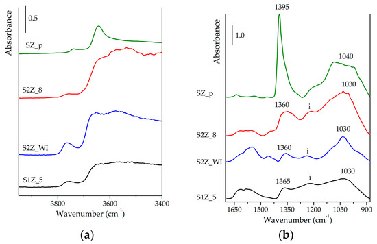 In the 1400–1000 cm−1 spectral range, it is possible to observe signals of sulphate species, see Figure 3b. The spectrum of activated SZ_p shows (i) an intense signal at 1395 cm−1 related to the S=O asymmetric stretching mode, (ii) a broad band at ca 1040 cm−1 due to the S–O stretching and (iii) a weak peak at 1180 cm−1 ascribable to the (O=S=O) symmetric mode. The increase of the spectral separation between high and low-frequency modes is ascribable to a high covalent character achieved by sulphates [5,44,46]. S2Z_8 and S2Z_WI exhibit comparable behaviour after activation. The band of the S=O mode at 1360 cm−1 is broad and relatively weak, and the broad band of the S–O mode is centred at ~1030 cm−1: both are attributable to sulphate species with a covalent character. There is also a broad and complex band centred at 1230 cm−1 (indicated as i in Figure 3b), suggesting that part of surface sulphates still possess a mainly ionic character, and S2Z_WI seems to present a major fraction of surface sulphates with covalent configuration. The spectrum of activated S1Z_5 exhibits a partially structured broad band in the 1400–900 cm−1 range. The presence of at least a fraction of covalent surface sulphates is supported by the spectral pair at 1365 and 1030 cm−1, but the relatively high intensity of the band at 1220 cm−1 could suggest that a large part of sulphates still retain a more ionic configuration. On the basis of these spectral features, it can be inferred that the nature of surface sulphate is strongly affected by both preparation and calcination methods, as already suggested in the literature [3,5]. If compared to SZ calcined in a conventional way, samples calcined by the MW-assisted procedure present sulphates with a less covalent character. Comparing the impregnation methods, the covalent character of surface sulphates is more pronounced in the sample prepared by WI (S2Z_WI) that possesses a low amount of sulphate groups. Samples impregnated with a larger amount of sulphating agent by the IWI procedure seem to present a major fraction of sulphates with ionic configuration.