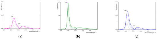 For plain and sulphated t-ZrO2, the RT adsorption of CO (reported in Figure 4a) has been shown to yield a strong signal in the 2200–2180 cm−1 spectral range, related to CO interacting with coordinatively unsaturated surface (cus) Zr4⁺ cations located in defective crystallographic positions: CO frequency increases upon sulphation indicating an increase of the L acidity of cus cations [48,55]. In the case of plain t-ZrO2 (Z1), CO adsorption gives rise to a strong signal at 2181 cm−1 and to a shoulder at 2155 cm−1, well recognisable at maximum pressure (100 torr). The former signal is ascribable to CO adsorbed on the most acid L sites, i.e., cationic sites located on defective crystallographic configuration, and the latter has been assigned to CO uptake onto more ordered sites, i.e., cus cationic sites located on extended patches of regular crystal planes [48]. Upon CO adsorption on the SZ_p sample, a strong and sharp signal is observed at 2200 cm−1, which decreases in intensity with decreasing CO coverage, as shown in Figure 4b, suggesting the presence of strong L sites. In the SZ samples obtained by the MW-assisted method, the related signal can be observed at lower wavenumbers (as shown in Figure 4c and Figure S6), and so L strength is supposed to decrease as follow: SZ_p > S2Z_8 > S1Z_5 > S2Z_WI. The intensity of the signal of SZ samples is comparable to that of Z1 one, suggesting that sulphation reduces only partially the number of L-acid sites and increases only to a very limited extent their acid strength. For all MW-synthesised samples, it is possible to observe a shoulder at 2155 cm−1, probably related to CO absorption on regular planes. We may suppose that this feature could be related to the MW-assisted calcination step, which seems to generate heterogeneous surface sulphates that occupy both defective and regular sites, while on ‘model’ systems, only the defective sites are set free and may interact with CO molecules.
