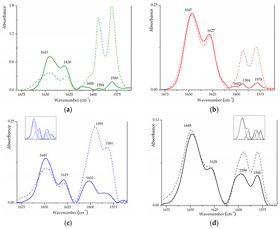 2,6-DMP uptake can reveal the presence of acidic sites that differ either in nature (i.e., L or B) and/or in acidic strength. 2,6-DMP adsorption on SZ_p (in Figure 5a) gives rise to spectra similar to those reported for similar tetragonal SZ [51]. At the maximum pressure (~4 torr), the strongest signals are represented by the two bands at 1594 and 1580 cm−1 (ascribable to H-bonded and physisorbed 2,6-DMP molecules, respectively), with a shoulder at 1604 cm−1, due to l-coordinated 2,6-DMP, and by a broad envelope above 1620 cm−1, due to 2,6-DMPH⁺ strongly held to the surface, indicating the presence of medium-strength B acid sites. Upon outgassing, the overall intensity of the envelope at lower wavenumbers decreases drastically, as expected for the elimination of physisorbed/weakly held species, but bands at 1580, 1594, and 1608 cm−1 are still observable, suggesting the presence of strong L acid centres. The spectral features of 2,6-DMPH⁺ species remain strong, with only a partial modification in intensity and profile as well. For S2Z_8 (in Figure 5b), we can notice that at the maximum pressure, the strongest band is related to 2,6-DMPH⁺ modes, whose spectral profile remains virtually unchanged after outgassing. Signals related to the strongest L acid sites, which retain 2,6-DMP at low pressure, are observable at 1578, 1594 and 1604 cm−1, similar to those observed in a ’model’ system. On the contrary, both S2Z_WI and S1Z_5 exhibit a different behaviour: these two samples present the two bands related to 2,6-DMPH⁺ modes at 1648 and 1629 cm−1, ascribable to B acidity, and below 1620 cm−1, a resistant fraction of physisorbed and/or H-bonded 2,6-DMP is evident, giving rise to a multiple band still intense after evacuation. Curve fitting (by means of the facility present in the OMNIC software) of this unresolved band (in the inset of Figure 5c,d) suggests that it is composed of 3 distinct components located at ~1582, 1596 and 1604 cm−1, respectively—analogous to those observed in SZ_p and S2Z_8. The shape and position of these spectral components are more similar to that reported for t-ZrO2 [51] with respect to other analysed SZ materials. This suggests that for S1Z_5 and S2Z_WI sulphation effects, to a limited extent, the strength of the L acidity, even if the B acid sites are present on the surface. On the basis of the spectral features that were previously described, the proposed scale of the strength of L acidity is analogous to that suggested by CO absorption, and the same trend is also suggested for B acidity (SZ_p > S2Z_8 > S2Z_WI > S1Z_5).