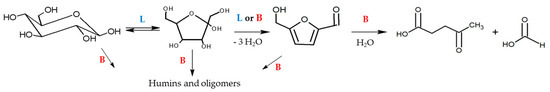 Acid hydrolysis of glucose was carried out at 180 °C in a solution with a low concentration of substrate (0.027 M) to minimise the side reactions of the products, as suggested by similar studies [15,17]. Experimentally, it has been noted that glucose-to-fructose isomerisation is favoured by L acid catalyst at 90~120 °C, while the fructose-to-HMF dehydration is promoted by both L and B acid catalysts at higher reaction temperatures (120–200 °C) [16]. Humins are unavoidable by-products that can significantly affect yield and cause catalyst deactivation and adsorbed intermediates and substrates. The formation of humins is suggested to be strongly affected by the initial substrate concentration, being produced in a second-order reaction [56].