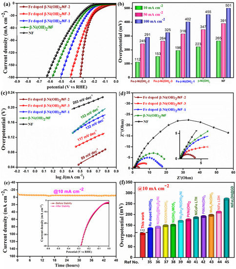 - Kou, T.; Wang, S.; Hauser, J.L.; Chen, M.; Oliver, S.R.J.; Ye, Y.; Guo, J.; Li, Y. Ni foam-supported Fe-doped β-Ni(OH)2 nanosheets show ultralow overpotential for oxygen evolution reaction. ACS Energy Lett. 2019, 4, 622–628. [Google Scholar] [CrossRef]