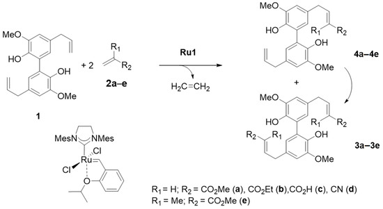 The synthesis of biseugenol 1 was achieved via the oxidative coupling of eugenol in the presence of K3[Fe(CN)6] as oxidant [46], and led to a 36% isolated yield of 1 with high purity after recrystallization (see experimental section). We have previously shown that the cross metathesis of eugenol with acrylates [42,43,44] was efficiently carried out in the presence of the second generation Hoveyda ruthenium catalyst Ru1 [47]. The isomerization of allylbenzene derivatives including 4-hydroxyphenylpropanoids in the presence of ruthenium olefin metathesis catalysts has been extensively described by van Otterlo [48], who suggested that the utilization of an isomerization inhibitor should be recommended to avoid this competing reaction leading to undesired metathesis products. From Figure 2, it appears that the cross metathesis of 1 with electron-deficient olefins should involve two successive steps leading to the mono cross metathesis products, the precursors of the di cross metathesis products 3a–3e.