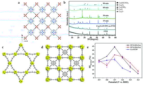 (a) Crystal structure of Cu2(CuTCPP) NSs along the c axis. Red is O, blue is N, gray is C, and cyan is Cu. (b) XRD of Cu2(CuTCPP) NSs on an F-doped tin oxide (FTO) electrode with different reaction times []. Copyright 2019, RSC. Structural models of (c) PCN-222(Cu) and (d) PCN-224(Cu). (e) FEHCOOH in 0.5 M KHCO3 solution []. Copyright 2020, RSC.