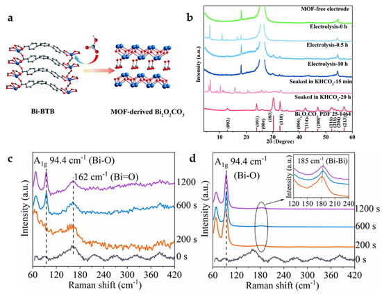 (a) Proposed mechanism for the formation of MOF-derived Bi2O2CO3. (b) XRD patterns of carbon paper electrode (green), Bi–BTB/carbon paper electrode before electrolysis (sky blue), after 0.5 h electrolysis (steel blue) and after 10 h electrolysis (dark blue), and Bi–BTB soaked in KHCO3 after 15 min (salmon) and after 20 h (firebrick) []. Copyright 2020, RSC. In situ Raman spectra of Bi-BTC during the catalytic process under various potentials: (c) −0.5 V and (d) −0.7 V at 0.1 M KHCO3 []. Copyright 2022, Elsevier.