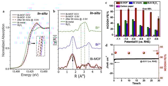 There are also some interesting findings in the study of Bi-BTC MOF (CAU-17). Through the operando X-ray absorption fine structure (XAFS) analysis (Figure 5a,b), it is found that CAU-17 keeps close to Bi3+ for more than 90 min at −0.9 V, while 2D Bi NSs, Bi2O3 nanotube completely transformed into Bi0 within 1h. The MOF structure is thought to play a key role in maintaining Bi in the +3 oxidation state at the reduction potential, which is conducive to the long-term ECO2RR. CAU-17 reaches FEHCOOH of 92.2% at −0.9 V and maintains the product selectivity along with current density almost unchanged for 30 h (Figure 5c,d) [].