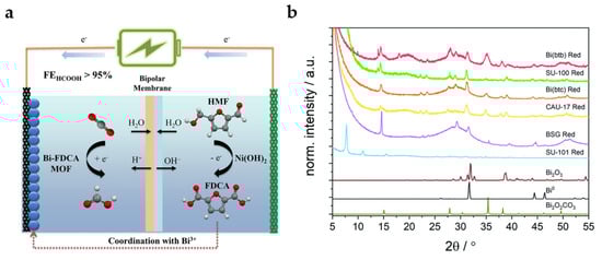 Replacing terephthalic acid (TA) derived from fossil fuels with 2,5-furandicarboxylic acid (FDCA) derived from biomass platform molecule 5-hydroxymethylfurfural (HMF) as the organic linker of MOFs is a strategy with economic and environmental effects (Figure 6a). The Bi-FDCA MOF also reaches a high FEHCOOH of 95.1% with a current density of 19.6 mA cm−2 at −1.2 V. Interestingly, FDCA can be obtained from the catalytic oxidation reaction of HMF in the anode, which effectively establishes the coupling system of anode and cathode [].