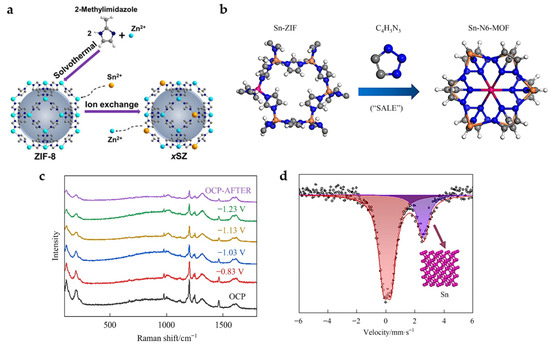 (a) Schematic illustration showing the preparation of Sn-doped ZIF-8 catalysts []. Copyright 2020, Wiley-VCH. (b) Diagram of the synthetic procedures for Sn-N6-MOF. (c) The in situ Raman spectra measured with varying the applied potential in CO2-saturated 0.5 M KHCO3 electrolyte. (d) Room temperature 119Sn Mössbauer spectra acquired after maintained at −1.23 V in CO2-saturated 0.5 M KHCO3 electrolyte for 1 h []. Copyright 2022, Elsevier.