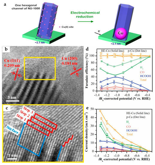 The electrocatalytic activity of Cu catalysts can be significantly enhanced by reducing the particle size, especially in the particle size range of less than 10 nm. In addition, electrochemically reduced Cu nanoparticles (NPs) from copper oxide appear to be particularly suitable for ECO2RR and have been shown to be superior to both polycrystalline Cu and hydrogen-reduced Cu from copper oxide at high temperatures. A solvothermal deposition in the MOF method is adopted to deposit Cu2+ in Zr-MOF (NU-1000). Cu NPs are further formed in electrochemical reduction, while the size of NPs is effectively limited by the pore size of MOF (Figure 9a), leading to a maximum FEHCOO− of 28% at −0.82 V in 0.1 M KClO4 electrolyte [].