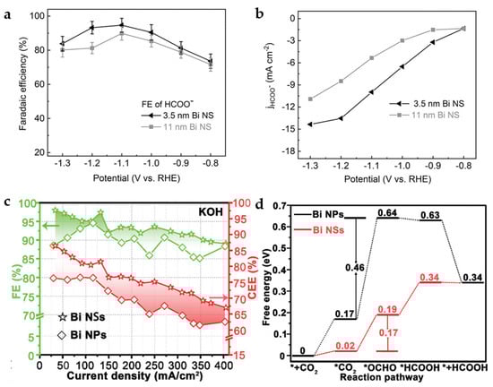 (a) FEHCOO− of 3.5 nm and 11 nm Bi NSs in CO2-saturated 0.1 M KHCO3. (b) Partial current densities for HCOO− of 3.5 nm and 11 nm Bi NSs []. Copyright 2021, Wiley-VCH. (c) FEs and CEEs for HCOOH of Bi NPs and Bi NSs in 1 M KOH. (d) Gibbs free-energy diagrams for CO2 electroreduction to HCOOH on Bi NPs and Bi NSs []. Copyright 2020, Wiley-VCH.