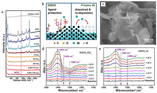 (a) In situ Raman spectra for showing the transformation from Bi-MOF to BMNS. (b) Proposed mechanism of action for ligands adsorbed on the surface of BiMNS preventing the deactivation of active sites []. Copyright 2021, Elsevier. (c) Scanning electron microscopy (SEM) images of Bi-ene. In situ ATR-IR spectra collected under different applied potentials in (d) CO2 and (e) Ar-saturated 0.5 M KHCO3 (all applied potentials are vs. Ag/AgCl in this part) []. Copyright 2020, Wiley-VCH.