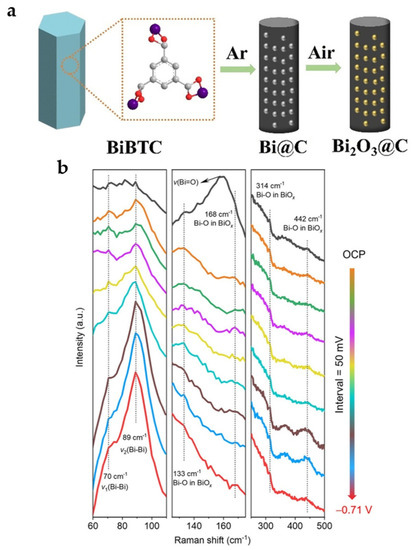 (a) Preparation of Bi@C and Bi2O3@C catalysts []. Copyright 2020, Wiley-VCH. (b) In situ Raman spectra of the (surface-oxygen-rich) SOR Bi@C NPs catalyst as a function of the applied potential in 1.0 M KOH electrolyte at various potentials []. Copyright 2022, ACS.