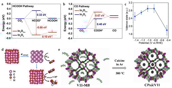 (a) Free-energy diagrams for CO2 electroreduction to HCOOH and (b) CO on In2O3 and In2O3−x. (c) Changes in In valence state in MIL-68-N2 under different applied potentials, which are examined by using the K-edge energy shift with respect to the commercial In2O3 sample. (d) The proposed reaction mechanism based on the operando measurements []. Copyright 2022, Springer Nature. (e) Illustration of the preparation process of CPs@V11 []. Copyright 2021, Wiley-VCH.