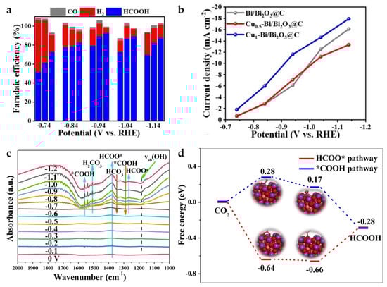 (a) FE of H2, CO, HCOOH for Cux-Bi/Bi2O3@C (x = 0, 0.5, 1). (b) Partial current density of HCOOH of different catalysts []. Copyright 2022, Wiley-VCH. (c) The in situ FT-IR spectra on CuBi75 catalyst at different applied potentials from 0 V to −1.2 V. (d) The free-energy diagrams of different pathways for CO2 electroreduction to HCOOH on CuBi75 (211) plane []. Copyright 2021, Elsevier.