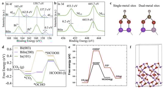 Bi has relatively weak binding energy to *OCHO, which makes it difficult to promote HCOOH production in ECO2RR. The electronic structure can be regulated through interaction with In. In-Bi-MOF is synthesized by a solvothermal method and ion-exchange process. The subsequent Bi-In alloy NPs are obtained by electrochemical reduction. The electronic interaction between In and Bi in Bi-In alloy NPs is demonstrated by XPS spectra (Figure 17a,b). The XPS peaks of Bi 4f shift toward a lower binding energy compared to Bi NPs, while the XPS peaks of In 3d shift toward a higher binding energy compared to In NPs, indicating electron transfer from In to Bi. Bi-In alloy NPs reach a maximum FEHCOOH of 97.8% in H-cell at −0.92 V and a FEHCOOH of 92.5% with a high current density of 300 mA cm−2 in the flow cell. In addition, the Bi-In alloy NPs achieve long-term electrolysis for more than 25 h in the MEA system at a current density of 120 mA cm−2, maintaining FEHCOOH of above 80%. The results of DFT calculations (Figure 17c,d) demonstrate that the bimetallic sites provide the best *OCHO binding energy and promote the generation of HCOOH [].