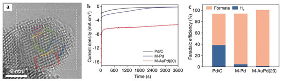 Pd is a catalyst capable of ECO2RR to HCOOH at a very low overpotential []. However, palladium-based electrocatalysts present significant challenges in terms of long-term stability, as trace amounts of CO are inevitably generated during ECO2RR, which can strongly adsorb on the Pd surface and leads to poisoning. Reduction in Pd precursors in the limited space of MOFs generates significant local tensile strain in the Pd NPs, which remains when a certain amount of Au is added to form M-AuPd. As the Cs-TEM image shows (Figure 18a), the pink dots indicate the dislocations and lattice distortions on the surface of the catalyst. Interestingly, the generation of tensile strain on the Pd surface typically enhances the adsorption energy of ECO2RR intermediates, including *COOH and *OOCH (*OCHO), while the dispersal of a single Au atom on the tensile-strained Pd surface selectively destabilizes *CO without affecting the other adsorbates. At a very positive potential, −0.25 V, FEHCOOH of above 99% and a current density of ~7 mA cm−2 are obtained, far exceeding commercial Pd/C and M-Pd without Au in catalytic activity and selectivity for formate (Figure 18b,c) [].