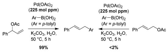 Typically, catalytic activity increases with decreasing catalyst concentration in reactions that are catalyzed by molecular catalysts, in situ-generated metal nanoparticles, and metal nanoparticles, which act as a reservoir of an active form of the catalyst [,,,,,,,], probably because the aggregation of metal species is more likely to occur by increasing the metal content in the reaction solution. Therefore, it is possible to select the reaction field in the solution and on the surface of the nanoparticles by changing the metal content. That is, in the case of a high amount of Pd, Pd easily aggregates and the reaction occurs on the surface of the Pd aggregates. In contrast, the reaction occurs in the solution phase in the case of a low amount of Pd. Indeed, we observed the expression of substrate-dependent selectivity at the mol ppm level of Pd loading in allylic arylation (Scheme 1) []. In this paper, it is proposed that the reaction with the blanch-type substrate proceeds in solution phase, and the linear-type substrate reacts on the surface of the nanoparticle.